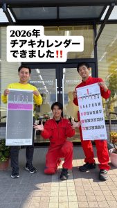 2026年版カレンダー完成しました!!2025.11.27フェア皆さん、こんにちは!!今年も日頃の感謝を込めて、テクニカルオートチアキオリジナルカレンダーをご用意しました!数に限りがありますので、お早めにどうぞ!皆様のご来店お待ちしております! Share RSS 新型クロスビー登場しました!!!前の記事 チアキ2号店看板完成しました!!次の記事